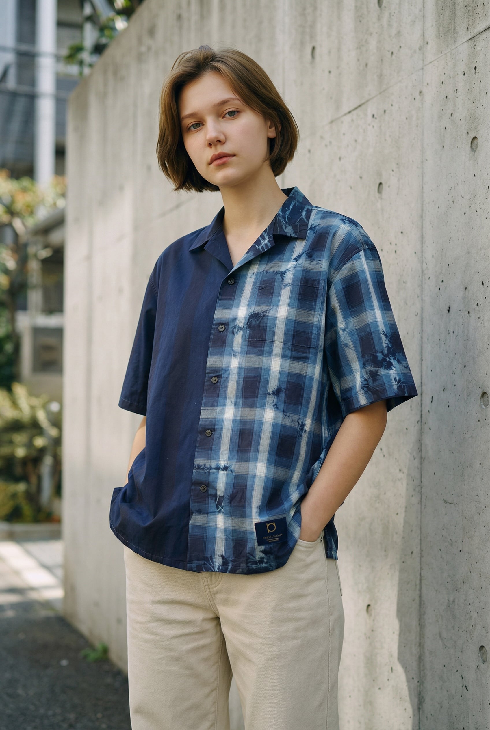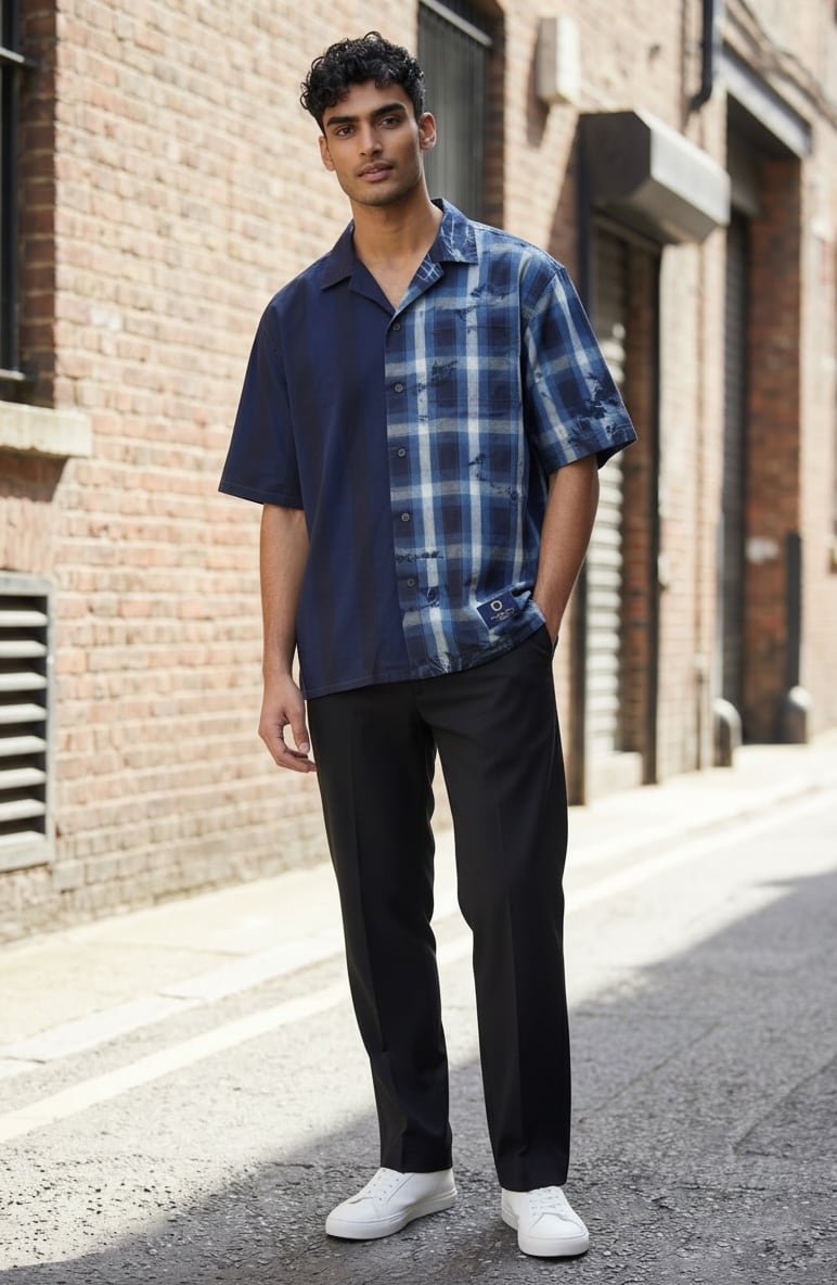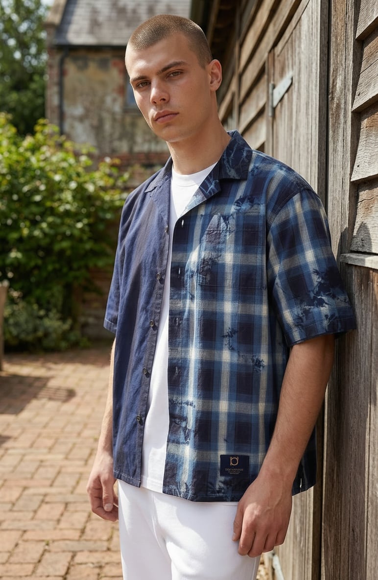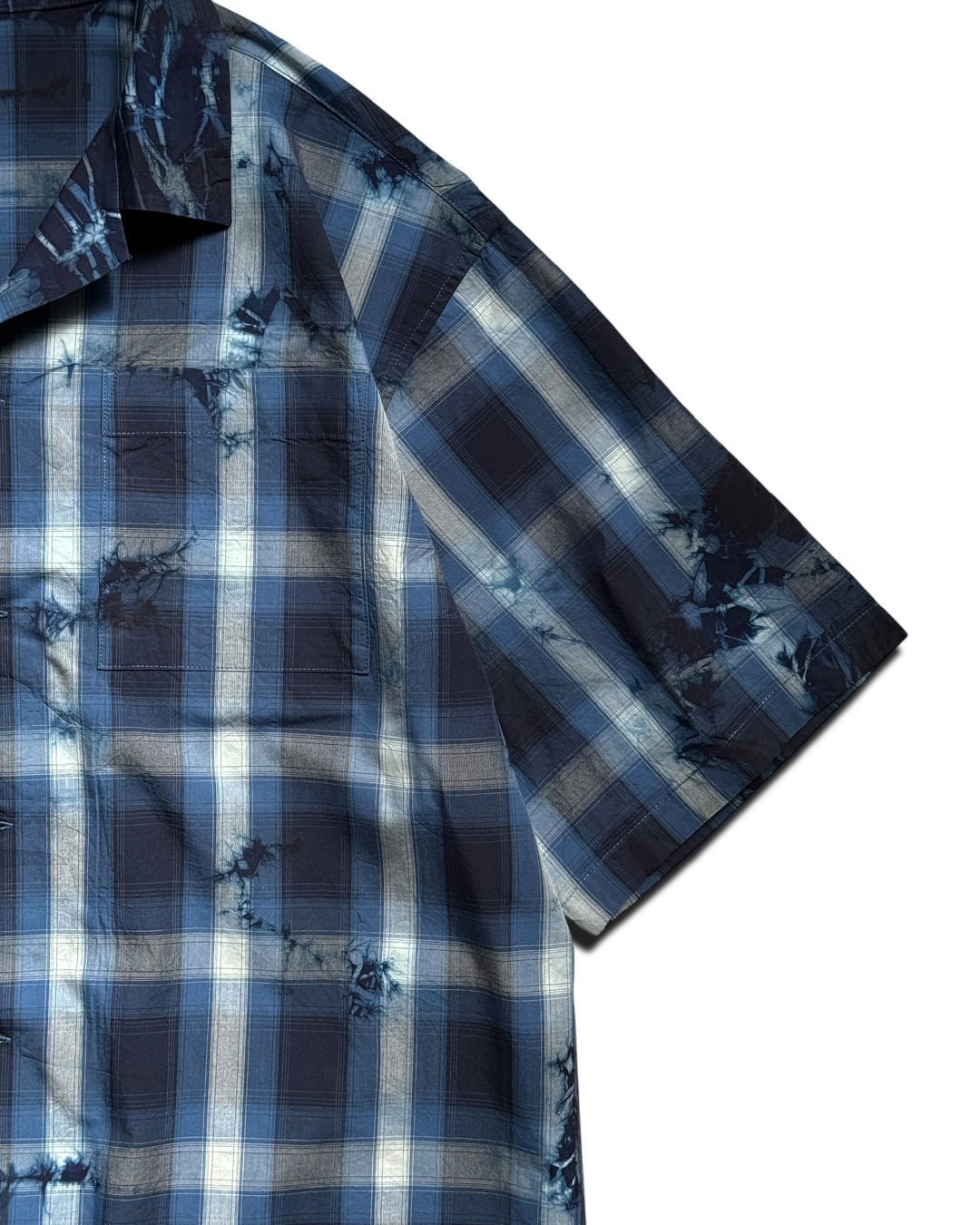 右身ごろを藍一色に、左身ごろを青のチェックシャツのデザインに仕上げた開襟シャツ。