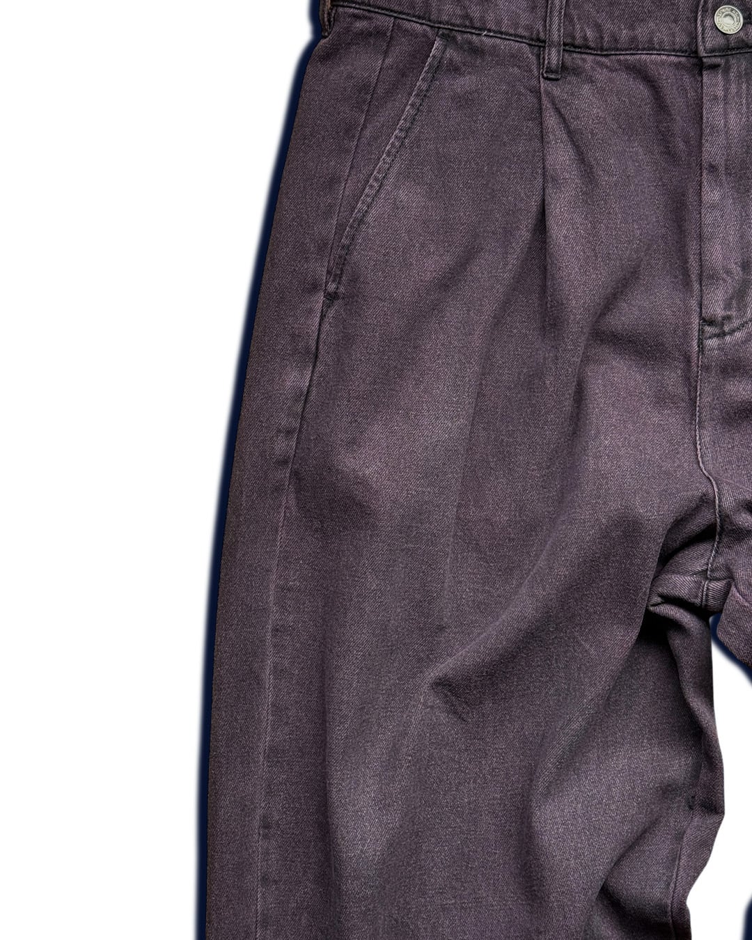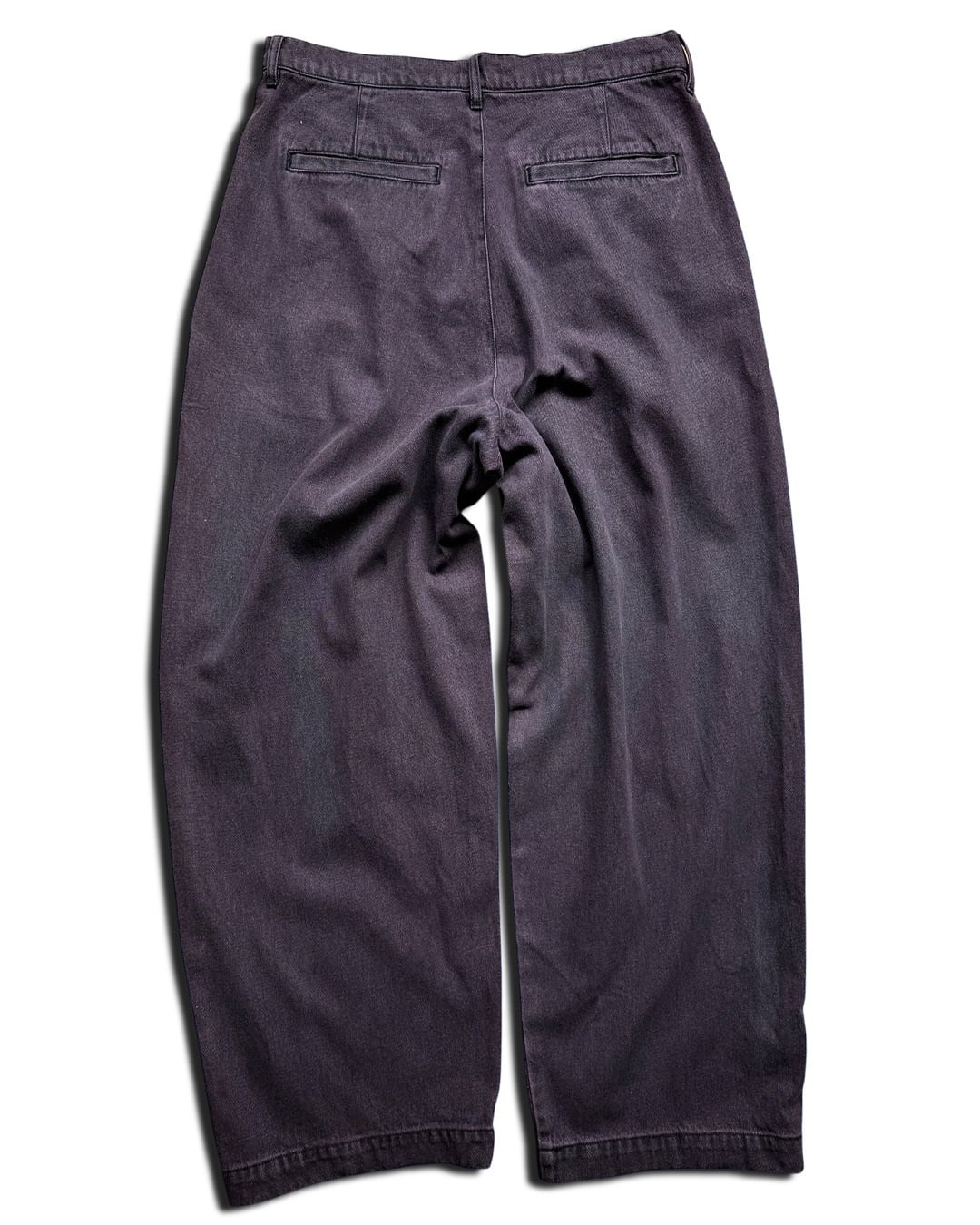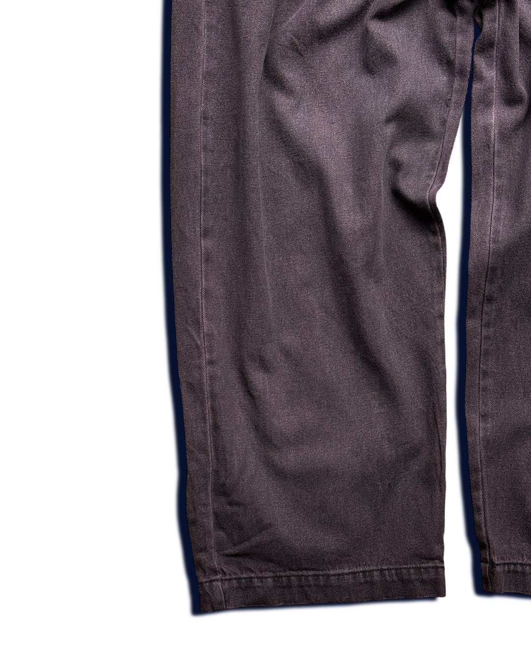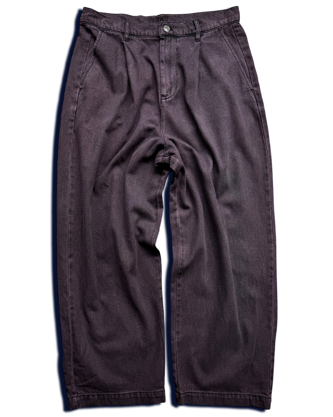 ウォッシュならではの所々黒が残る質感と紫に近いピンクの配色が唯一無二で、個性的ながらもダークトーンのため、意外と着回しも良いデニムパンツです。