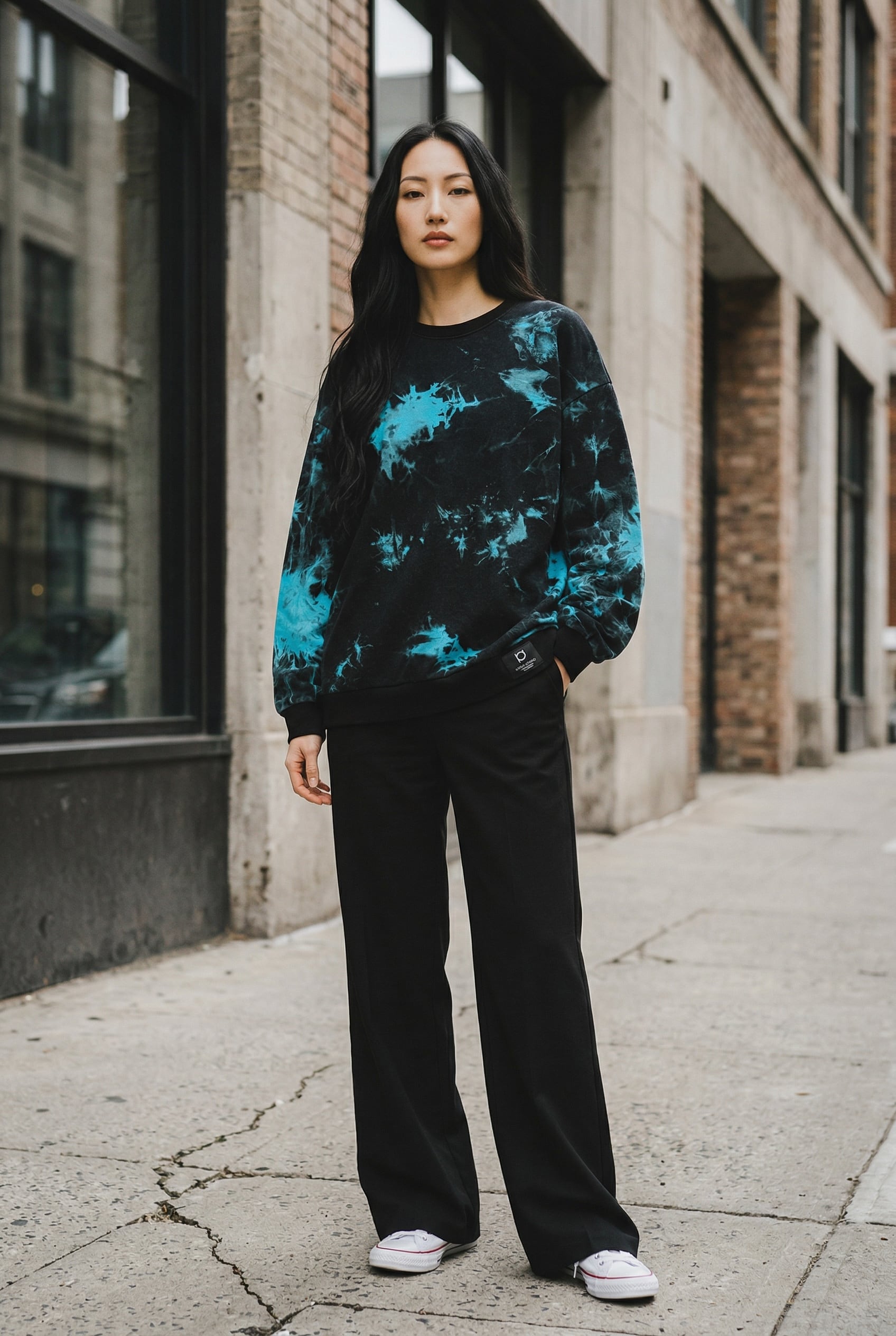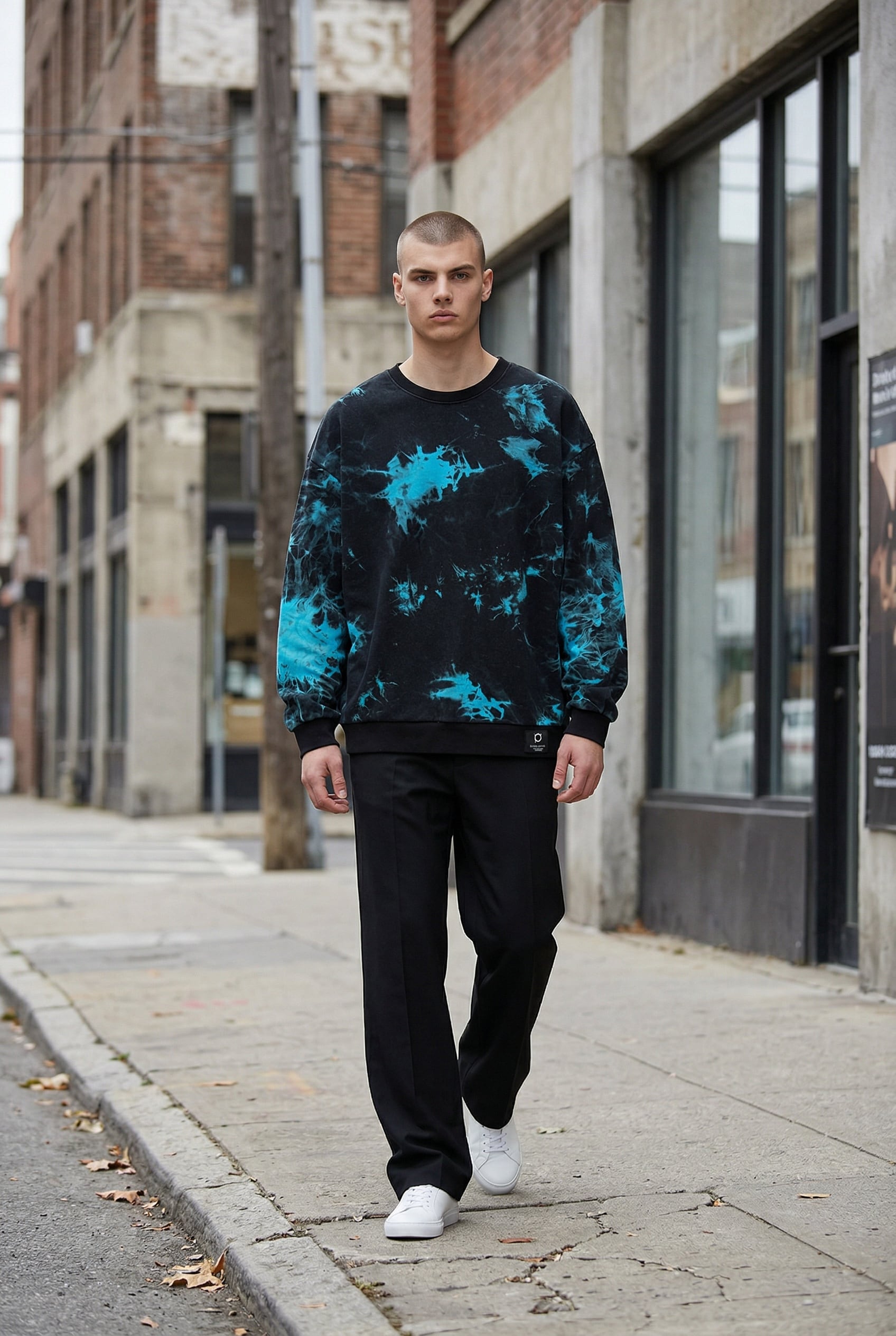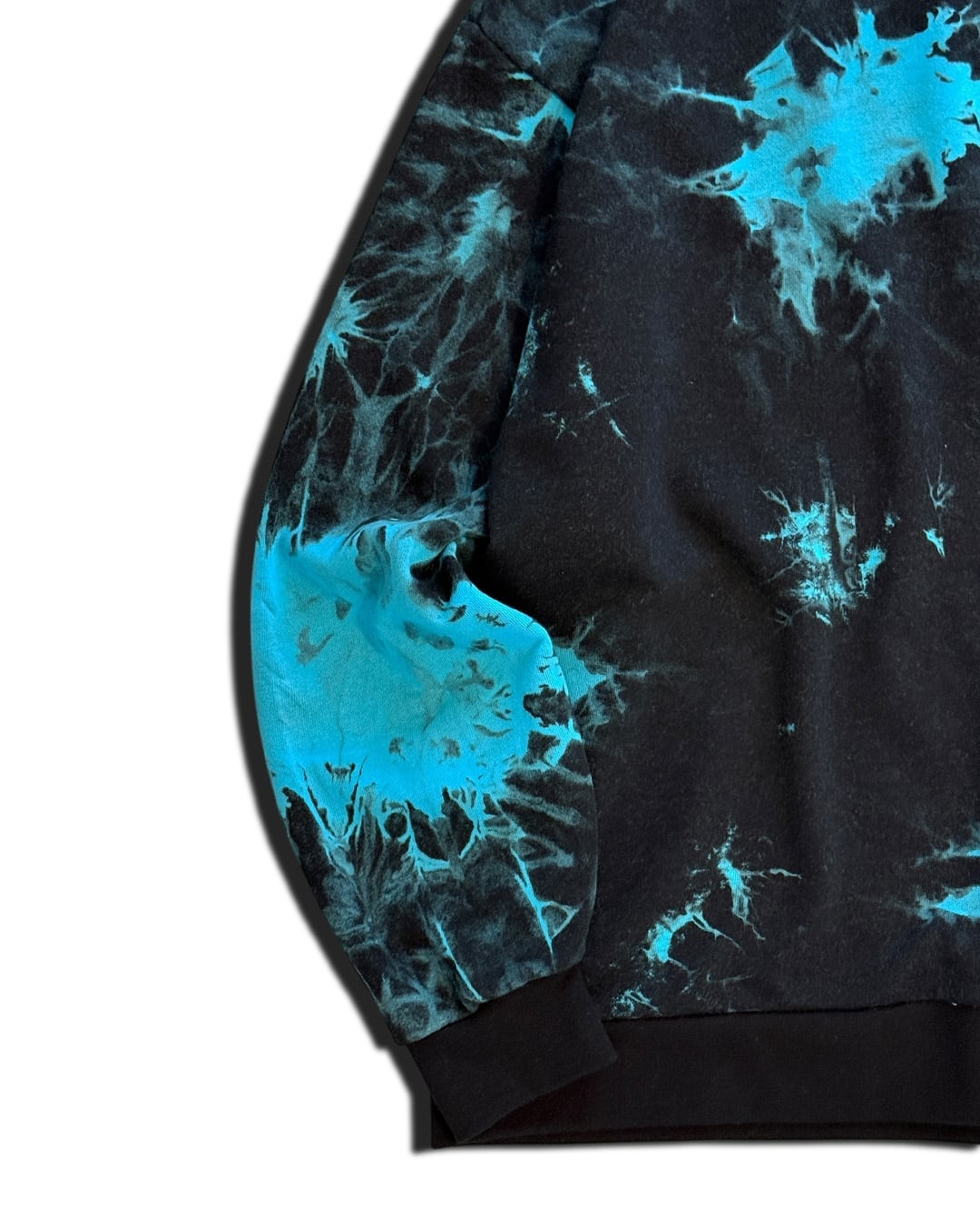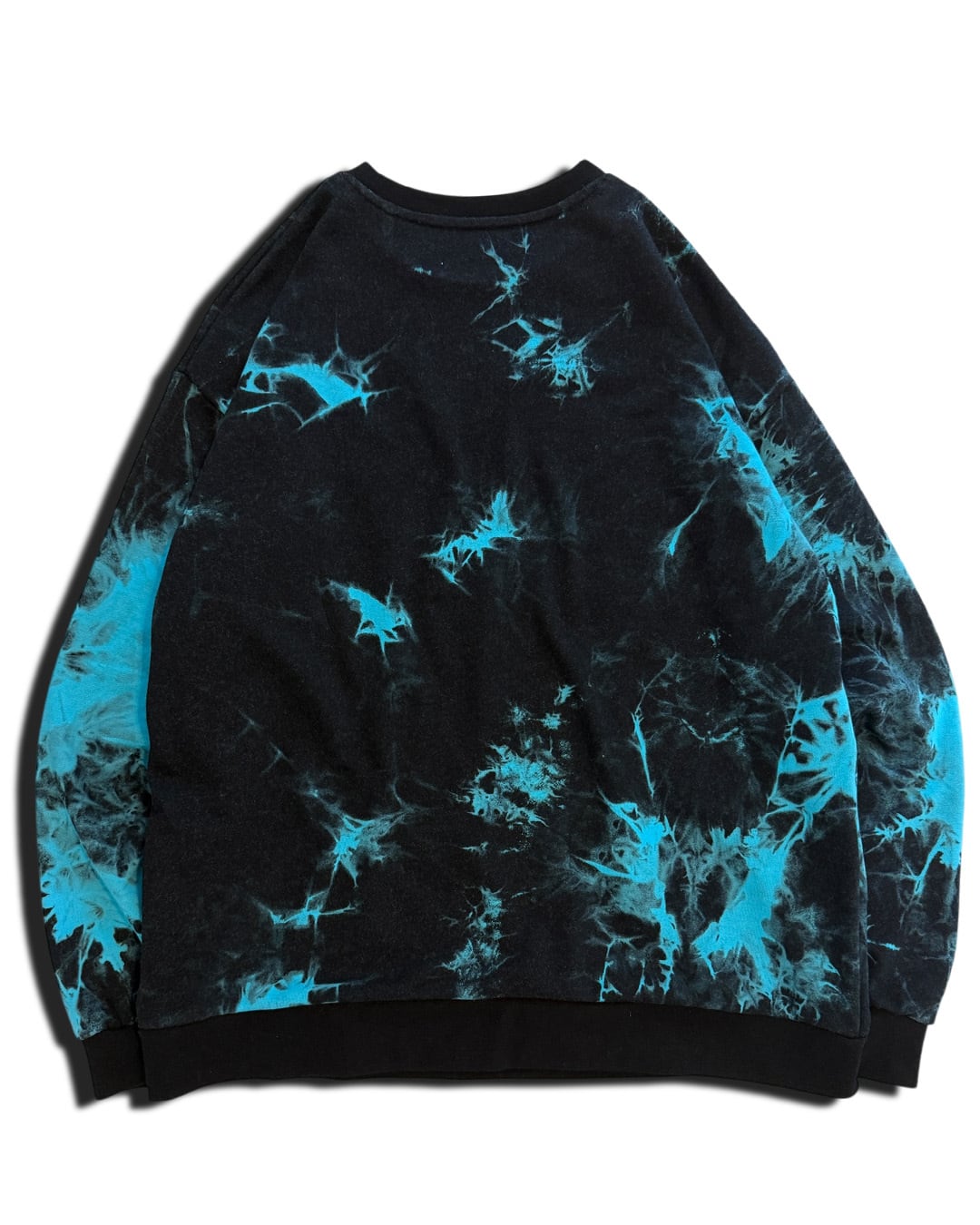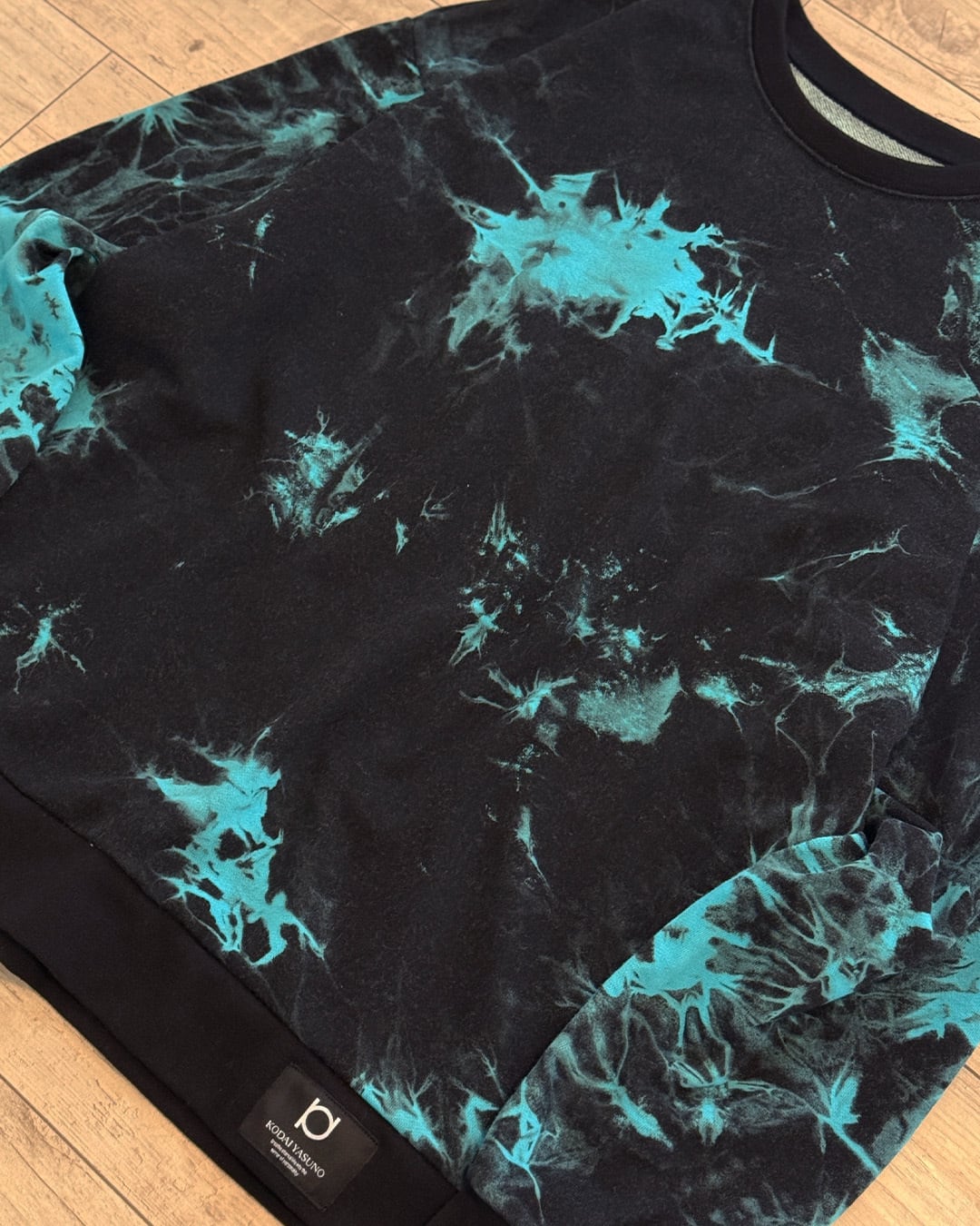 全体に絞りを加えて脱色したのち、美しいターコイズブルーにて染色を重ねて製作したパイルトレーナー。ウォッシュのかかった奥行きのある黒色にターコイズブルーが映えて、個性的と渋さが共存した1着。