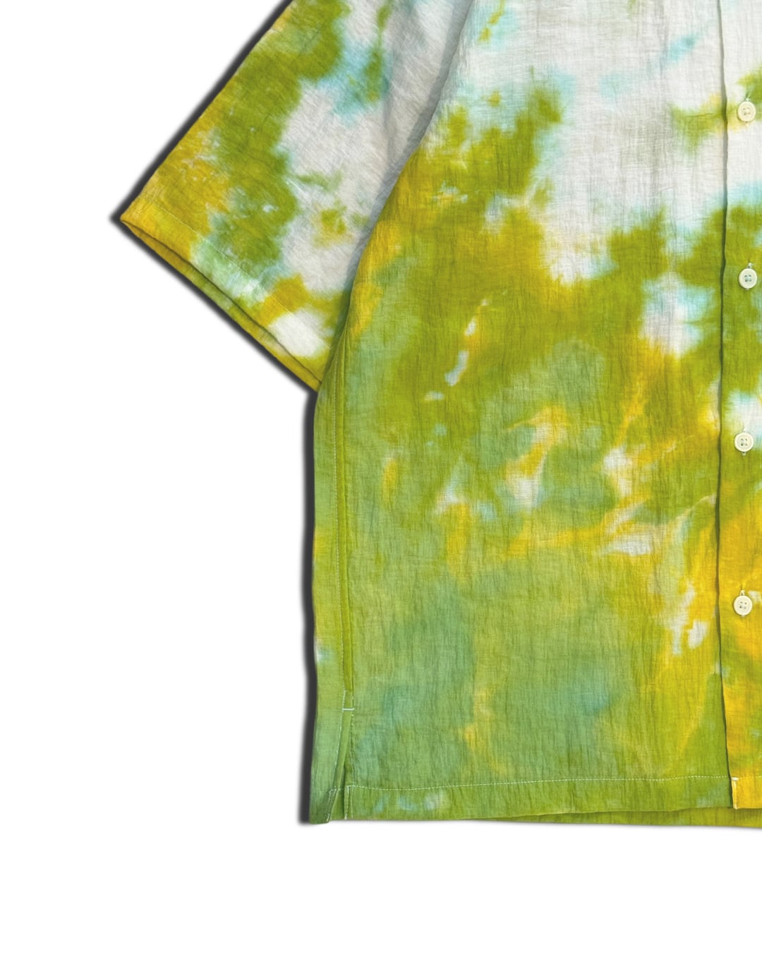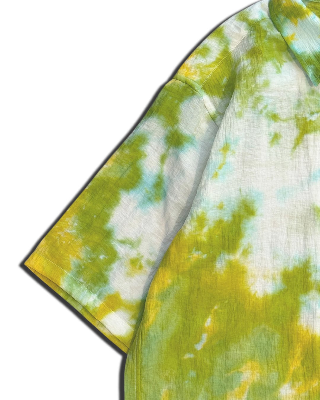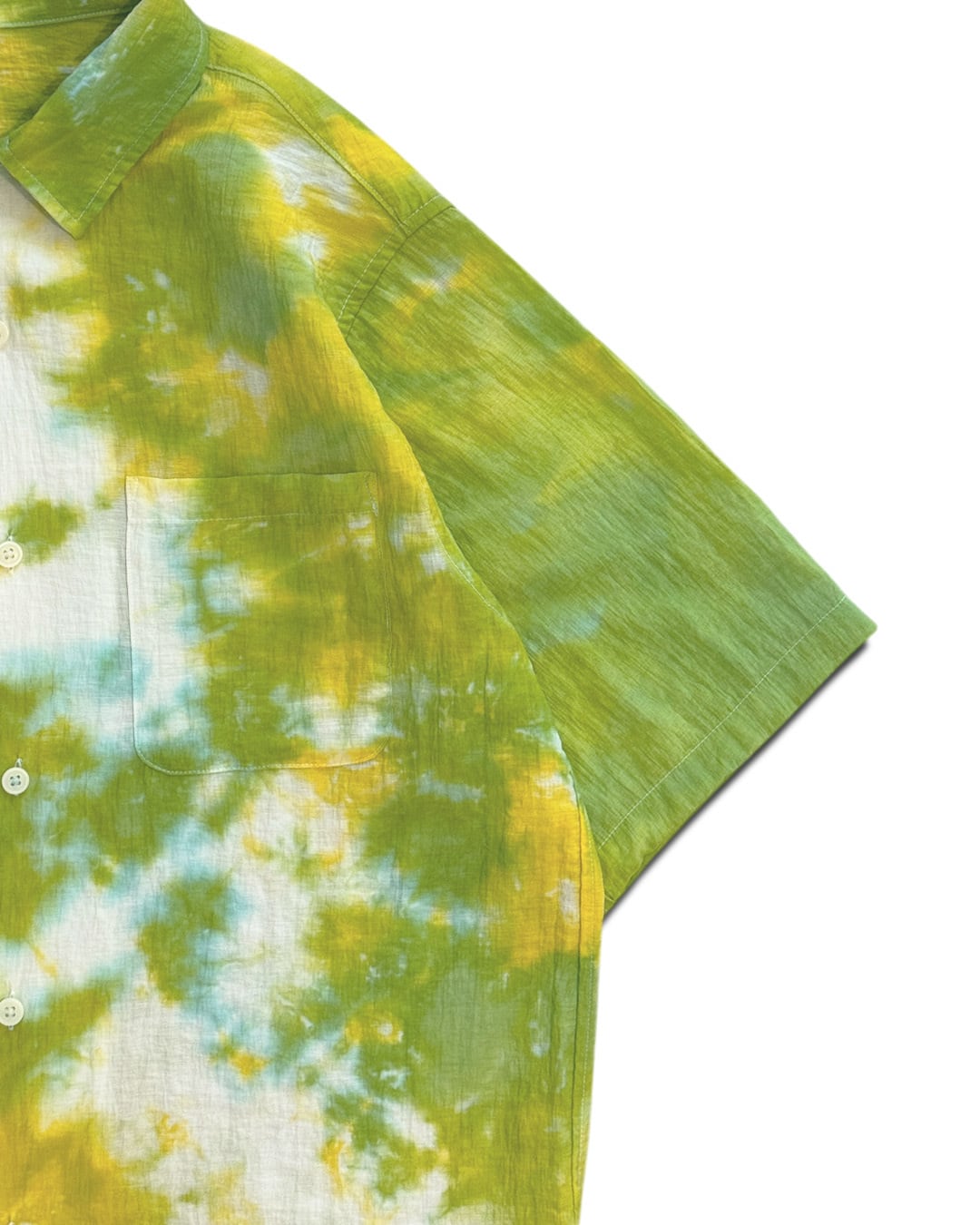 シャツの左上と右下部分を黄色と緑のタイダイ柄に染色した半袖シャツ。
