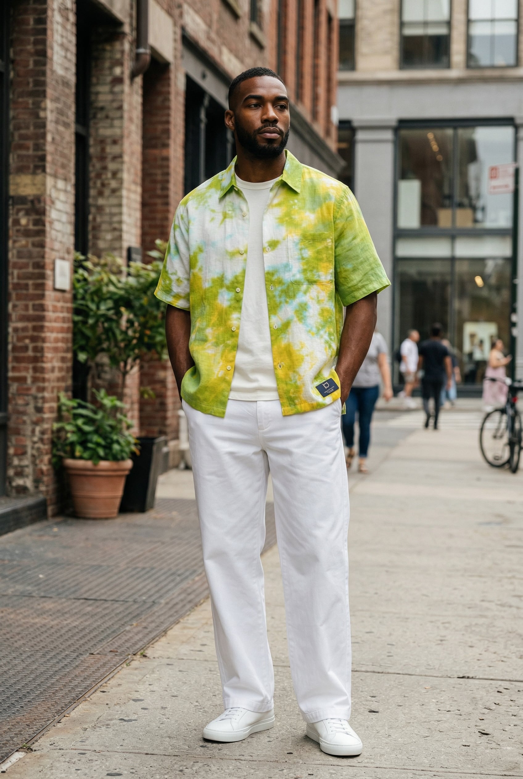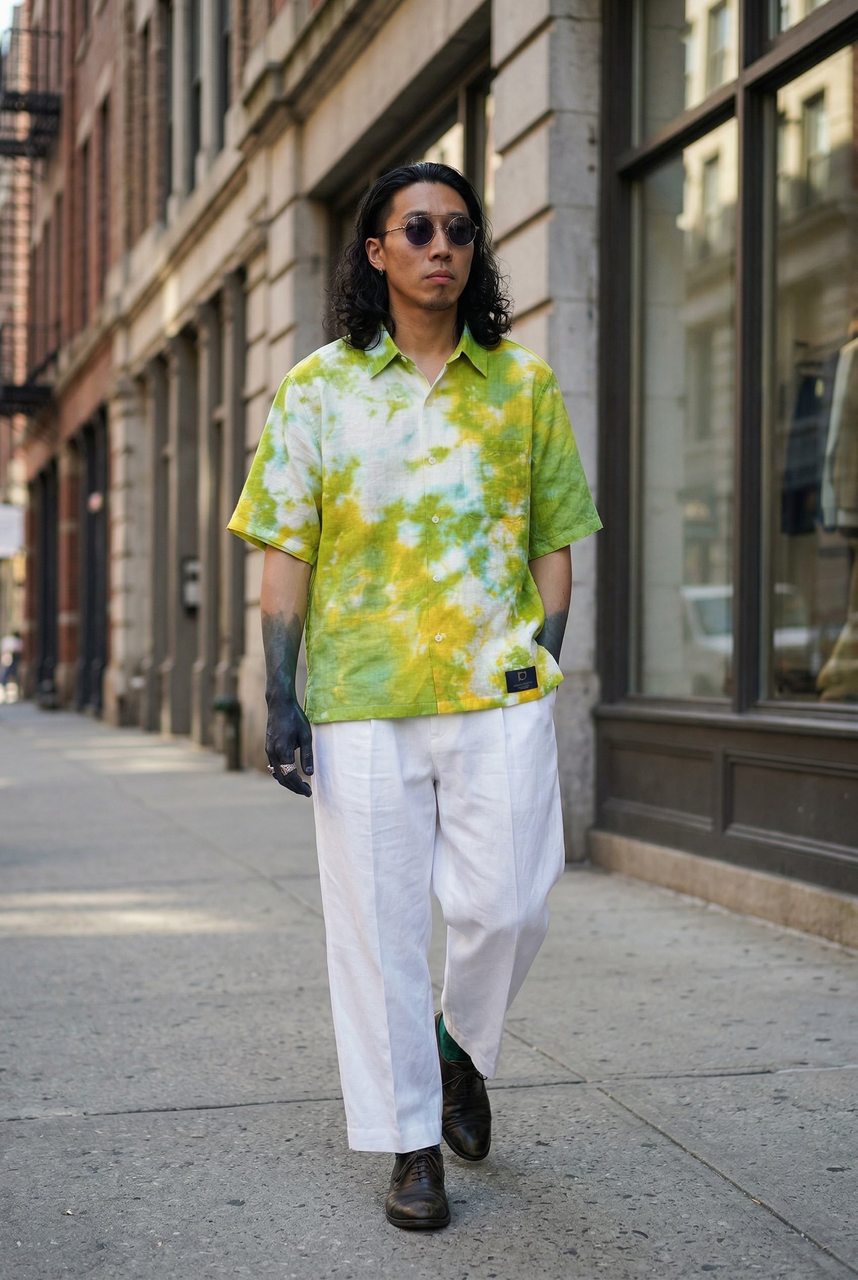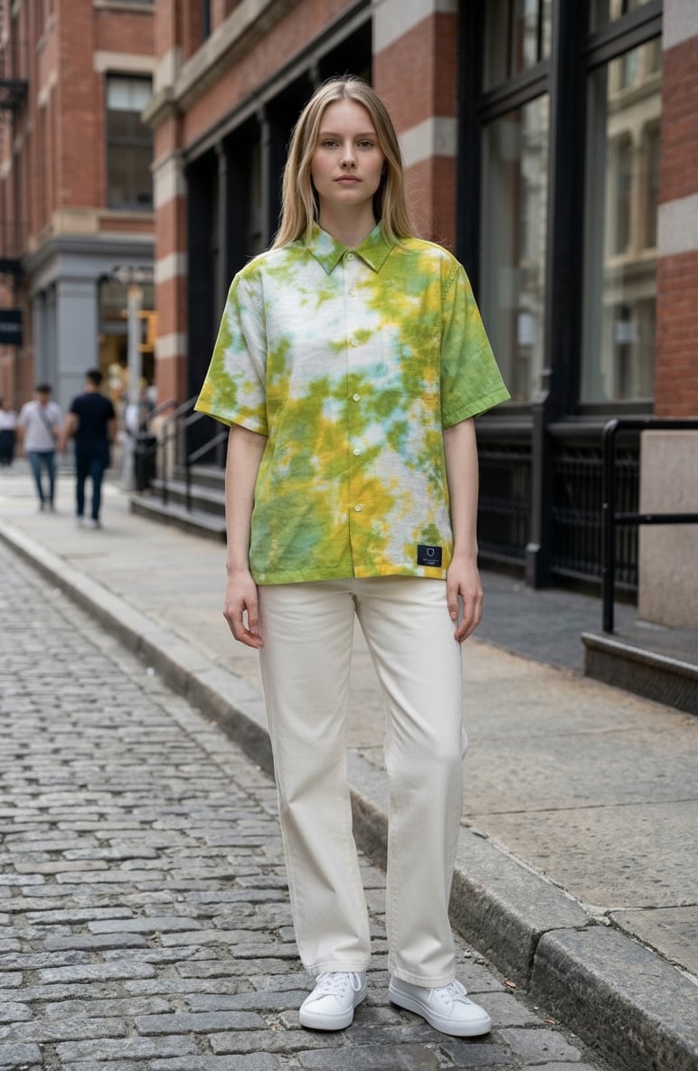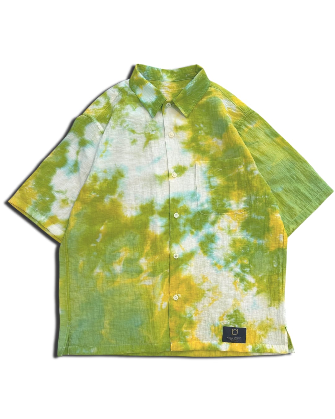 シャツの左上と右下部分を黄色と緑のタイダイ柄に染色した半袖シャツ。