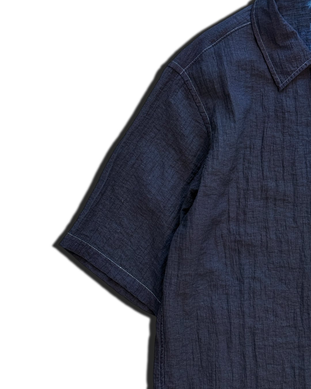 藍染めならではの深みのある青と白のコントラストが美しく、渋さと夏らしい爽やかさと凹凸感のある特殊生地の質感の個性的が融合した1着。デザイン・着心地ともにこの春夏活躍間違いなしの1点です。