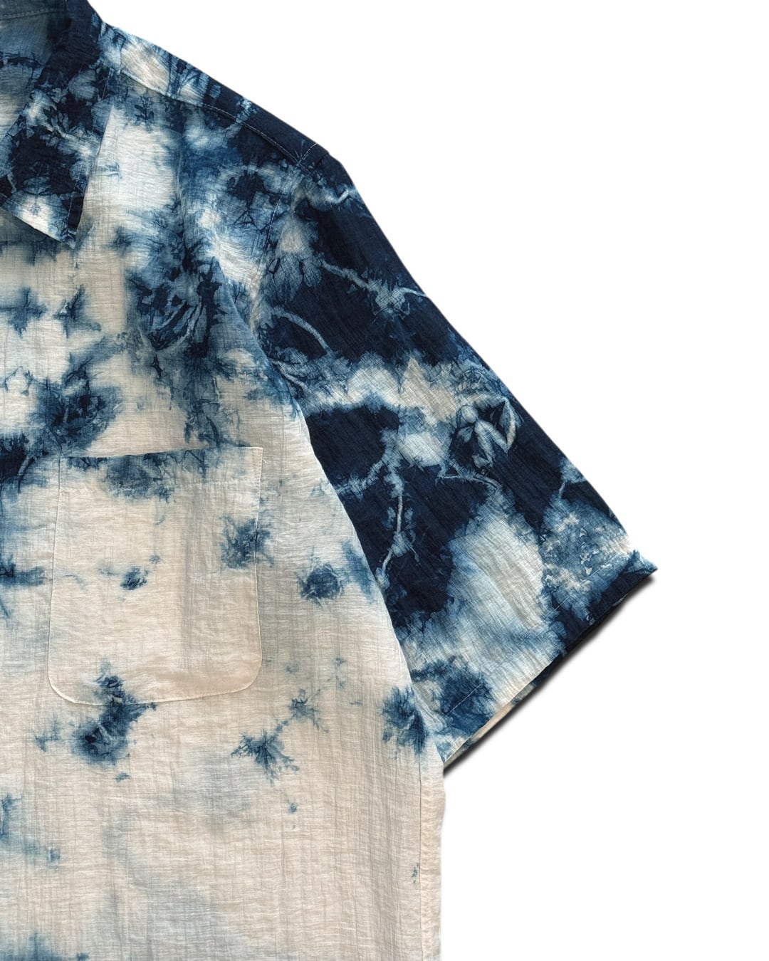 左半分をオフホワイトに藍のタイダイ柄が入るように、右半分を藍一色に染色した半袖シャツ。