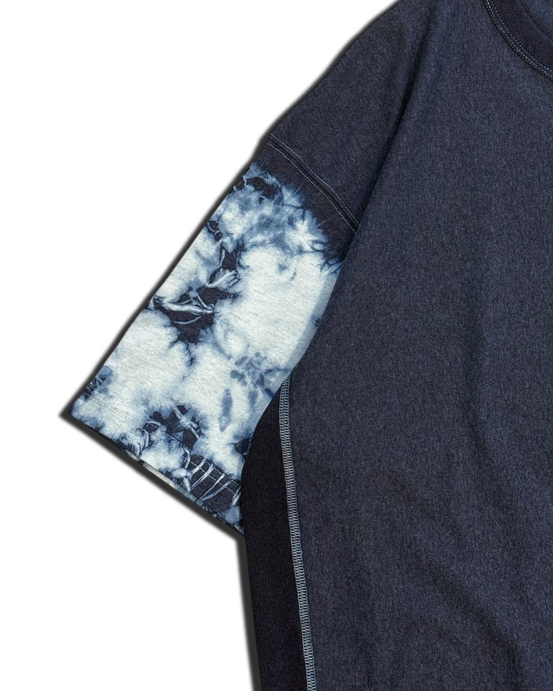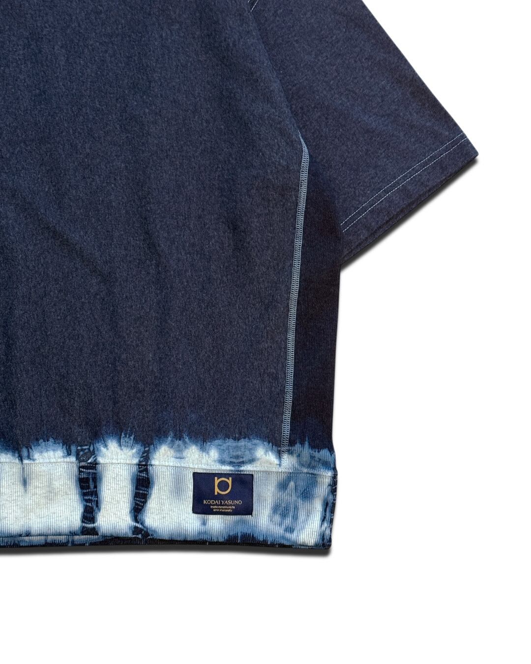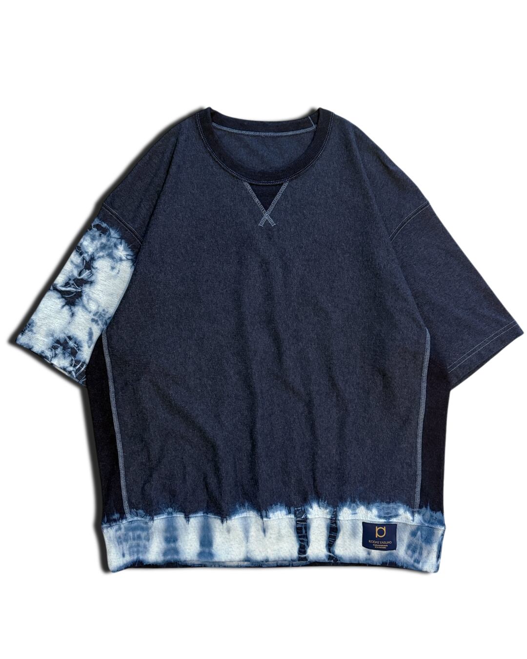 右袖と裾をグレーに藍のタイダイ柄が入るように、それ以外部分を藍一色に染色したスウェットTシャツ。