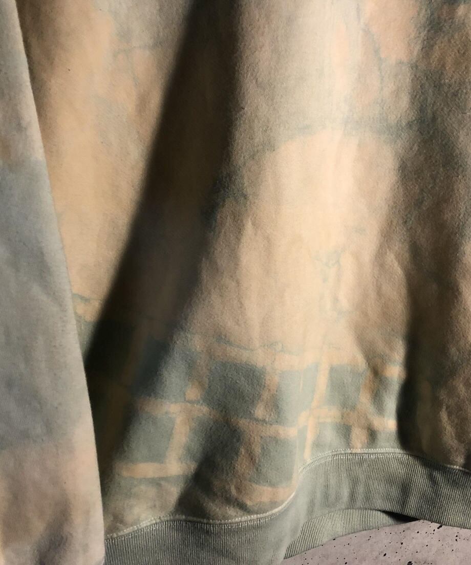 全体をベージュに染色した後、ライトグリーンでランダムにブロック状に染色した唯一無二の1着。