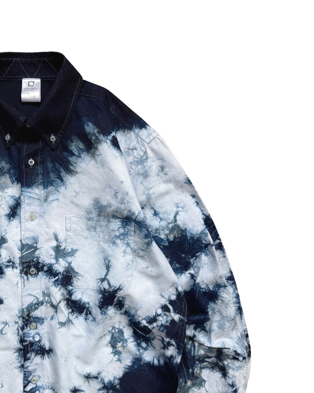 全体に絞りを加えて、藍染めにてタイダイ柄に染色したオックスフォードシャツ。