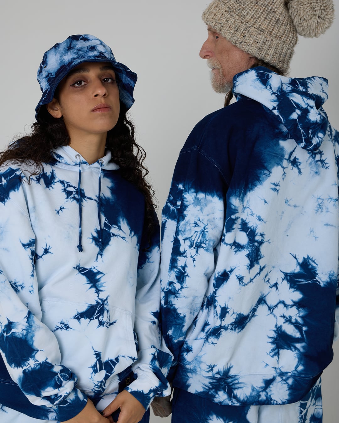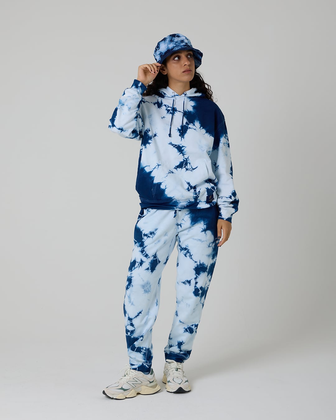 全体を藍染めのタイダイ柄に染色したスウェットパンツ。