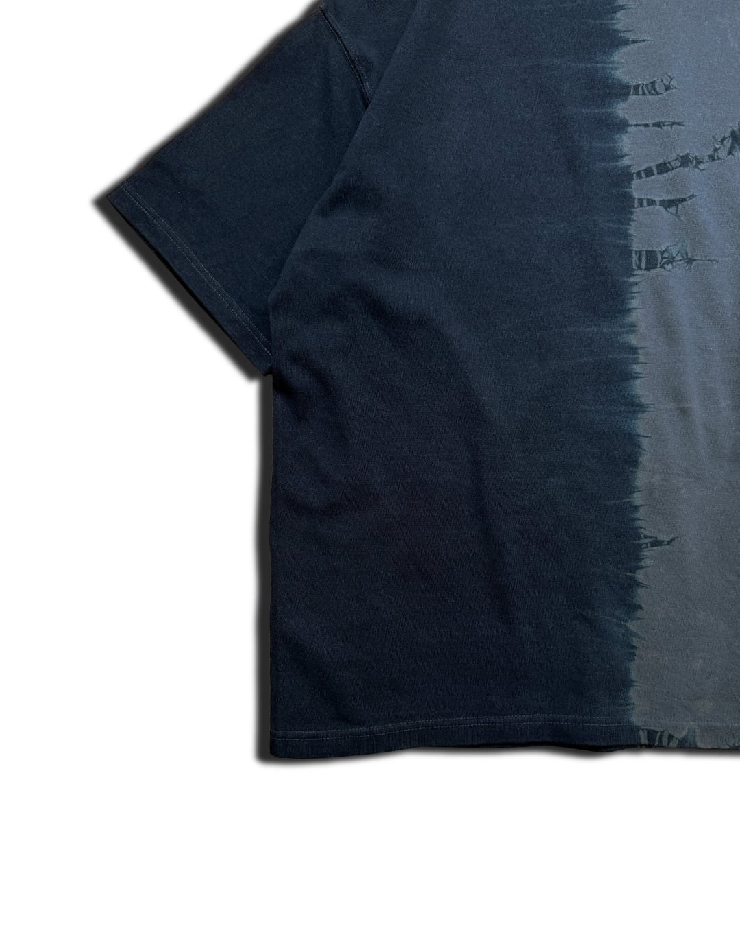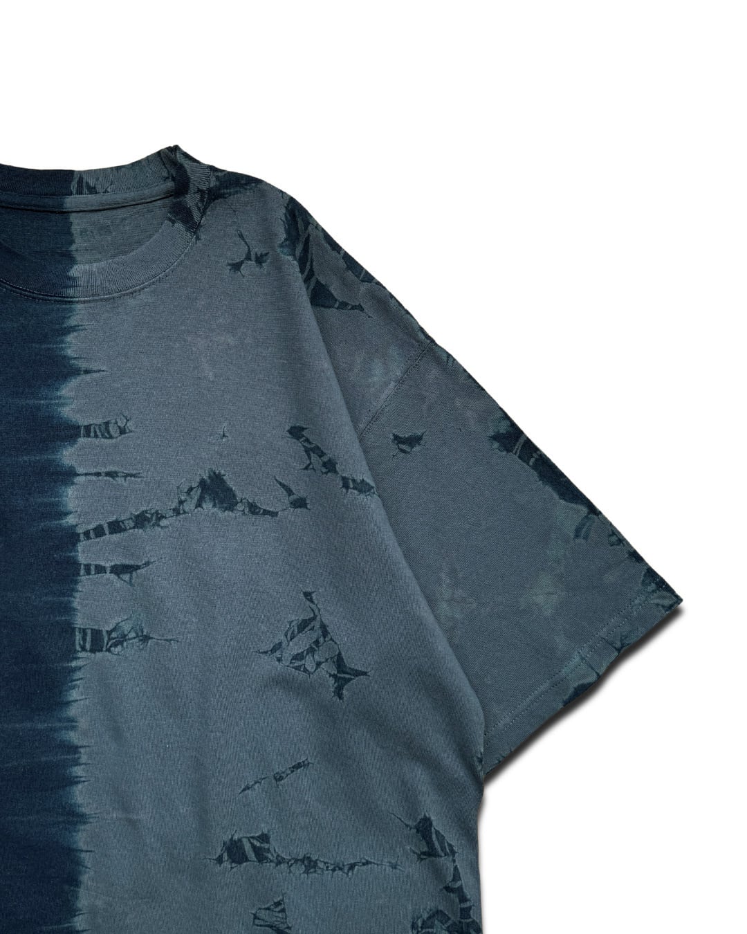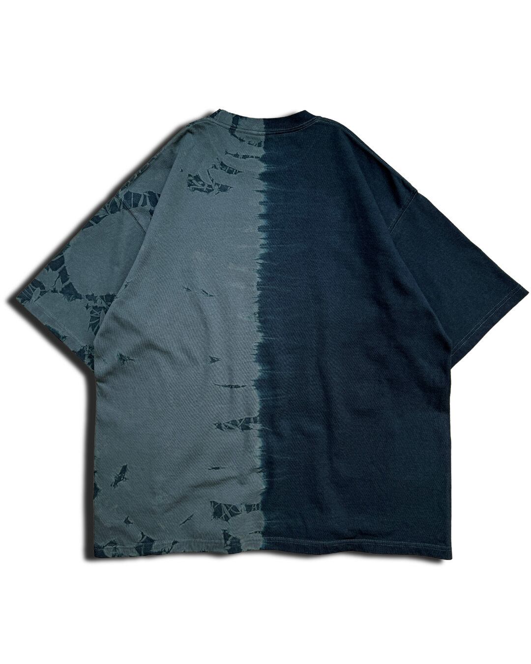 右半分を少々緑味がかったグレーに近い青に、左半分を藍染めにて染色した厚手のビッグシルエットTシャツ。